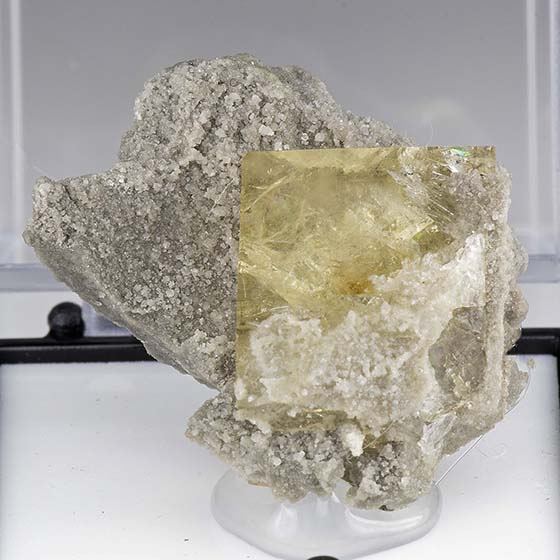 Pale yellowish glassy gemmy fluorite crystal 1.2 cm on edge on matrix. This is in good condition for this old classic locality. Mounted for display in a perky box and will ship as shown.Data last checked on 11th Aug 2021 - specimen may no longer be available