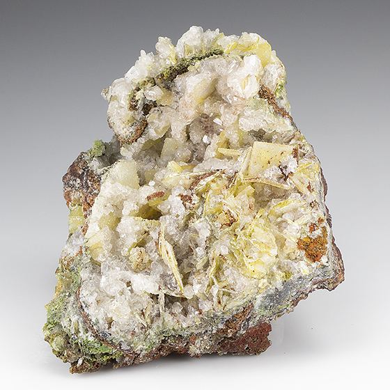 Yellow thin platy crystals of wulfenite to 1.1 cm in size across the front of this matrix with crystallized calcite. Typical of these, some chipping is present, still in good condition.Data last checked on 11th Aug 2021 - specimen may no longer be available