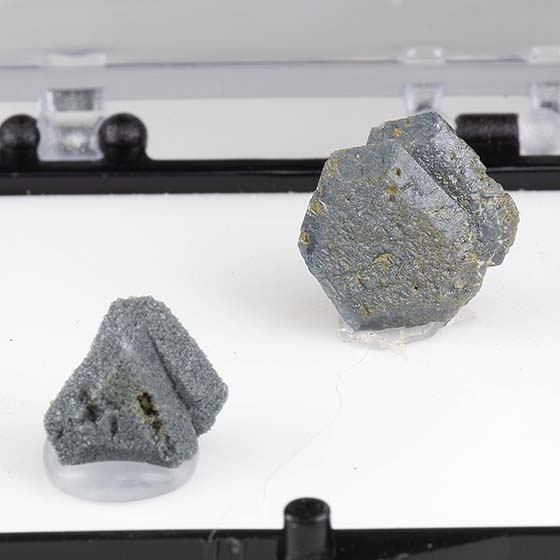 A set of two loose benitoite crystals. Size given is for the larger crystal in the back. Mounted for display in a perky box and will ship as shown.Data last checked on 11th Aug 2021 - specimen may no longer be available