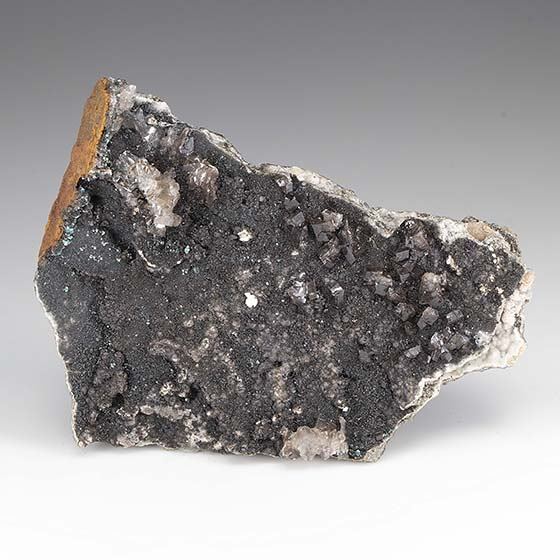 Very rich for the species, glistening black micro needlelike crystals of plattnerite thick throughout the top of this matrix. Calcite present as well.Data last checked on 11th Aug 2021 - specimen may no longer be available