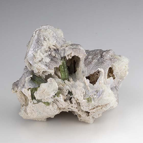 Neat specimen showing purple crystallized trilithionite in a matrix is cluster, this sort of dissolved away in the center leaving hollow cavities with green crystals of elbaite to 1.0 cm in size. In great condition.Data last checked on 11th Aug 2021 - specimen may no longer be available