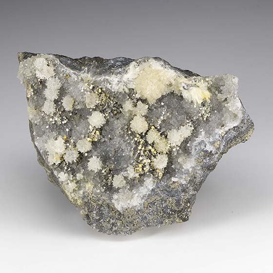 Colorless crystal groupings of wavellite to 1.0 cm in diameter across the front of this matrix with quartz and pyrite. Classic material for this locality.Data last checked on 11th Aug 2021 - specimen may no longer be available