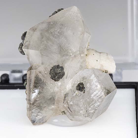 Gemmy crystals of quartz in a cluster with crystals of dolomite and marcasite . Mounted for display in a perky box and will ship as shown.Data last checked on 11th Aug 2021 - specimen may no longer be available