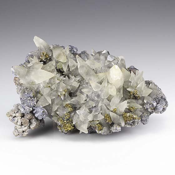 Colorless gemmy scalenohedral crystals of semi lustrous calcite to 1.4 cm in size across the top of this galena crystal matrix with chalcopyrite. Naturally crystallized all around and in very good condition with very minimal micro-cleaving present.Data last checked on 11th Aug 2021 - specimen may no longer be available