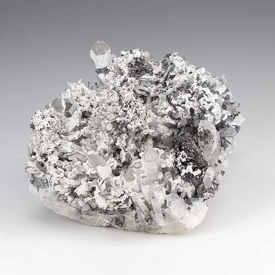 Glassy gemmy crystals of quartz to 2.0 cm in height across the top of this matrix with crystallized hubnerite, tiny micro stolzite crystals, pyrite, sphalerite, and galena.Data last checked on 11th Aug 2021 - specimen may no longer be available