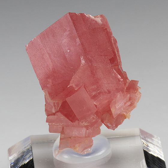 Beautiful glassy partly gemmy pinkish red grouping of rhombohedral rhodochrosite crystals. At first appearance it seems there is some chipping along one edge, this however is completely natural and the piece is in great condition. Shows well all around. Collected in 2004.Data last checked on 11th Aug 2021 - specimen may no longer be available