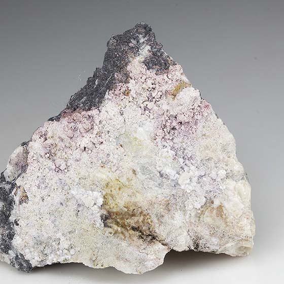 Colorless micro crystallized across the top of this matrix with pearly white rosettes of guerinite and pinkish erythrite. Barite present as well.Data last checked on 11th Aug 2021 - specimen may no longer be available