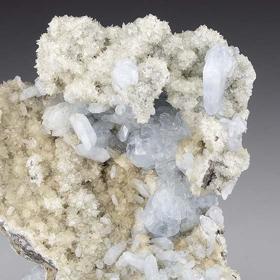 Nice for this old locality with light blue crystals of Celestine to 1.0 cm in size across a brecciated matrix with crystallized calcite. In good condition.Data last checked on 11th Aug 2021 - specimen may no longer be available