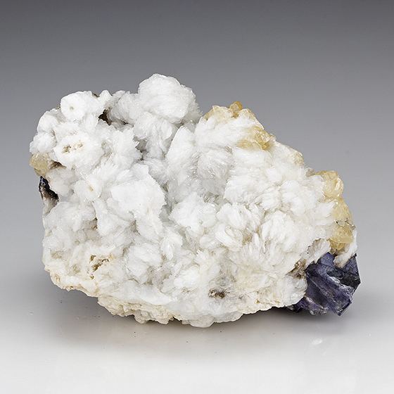Sparkling colorless crystals of barite across the top of this fluorite matrix with small yellow calcite crystals. In good condition.Data last checked on 11th Aug 2021 - specimen may no longer be available