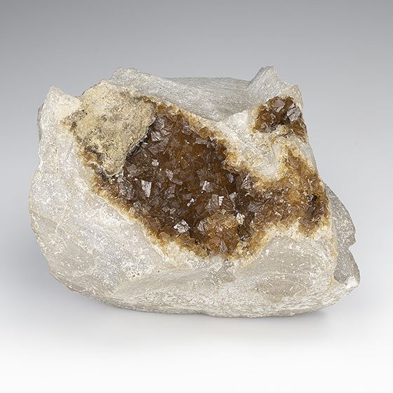 Glistening dark honey colored cubic crystals of fluorite averaging 0.5 cm in size across the top of this matrix. In good condition.Data last checked on 11th Aug 2021 - specimen may no longer be available