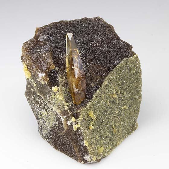 Deep amber colored gemmy crystal of barite to 2.4 cm in height on a brecciated matrix with crystallized calcite. In good condition.Data last checked on 11th Aug 2021 - specimen may no longer be available
