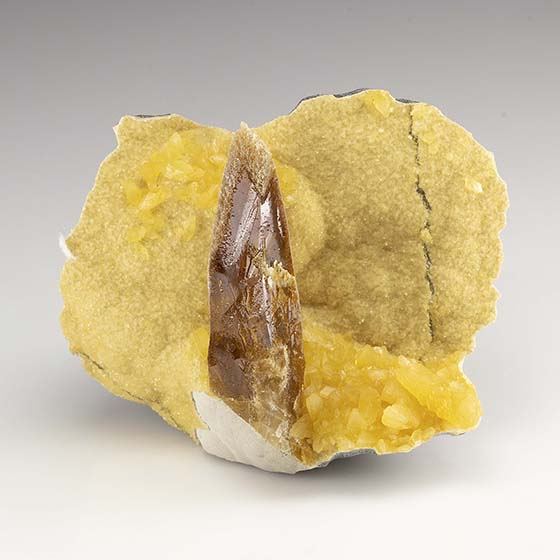 Very pretty gemmy amber glassy terminated crystal of barite 3.3 cm in height on yellow crystallized calcite. In good condition.Data last checked on 11th Aug 2021 - specimen may no longer be available