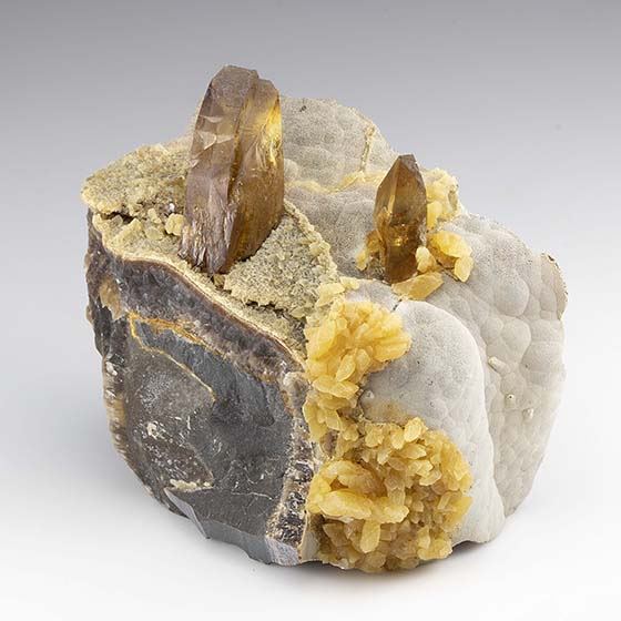 Deep amber colored gemmy crystals of barite to 2.5 cm in height on a brecciated matrix with crystallized calcite. In good condition.Data last checked on 11th Aug 2021 - specimen may no longer be available