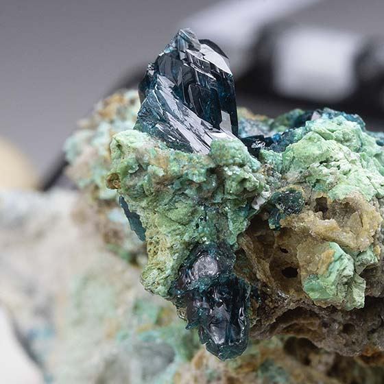 Very choice for the species, sparkling blue crystals of veszelyite across the top of this matrix. In good condition with minimal micro-chipping present. Mounted for display in a perky box and will ship as shown.Data last checked on 11th Aug 2021 - specimen may no longer be available