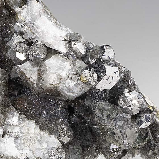 Brilliant lustrous metallic crystals to 0.7 cm in size across the front of this matrix with calcite. Nice example for the species.Data last checked on 11th Aug 2021 - specimen may no longer be available