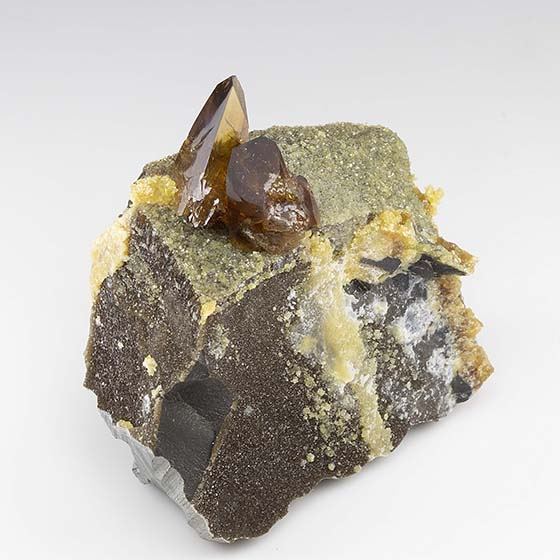 Deep amber colored gemmy crystals of barite to 1.8 cm in height on a brecciated matrix with crystallized calcite. In good condition.Data last checked on 11th Aug 2021 - specimen may no longer be available