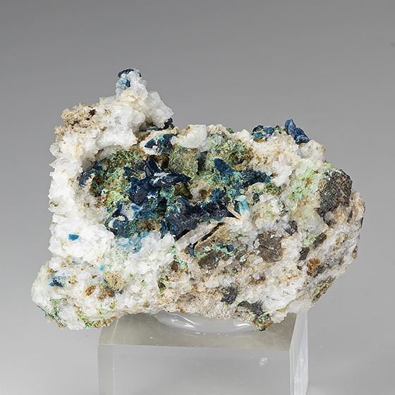 Lustrous blue bladed crystals of veszelyite to 0.8 cm in size throughout this matrix. In good condition and excellent for this rare mineral.Data last checked on 11th Aug 2021 - specimen may no longer be available