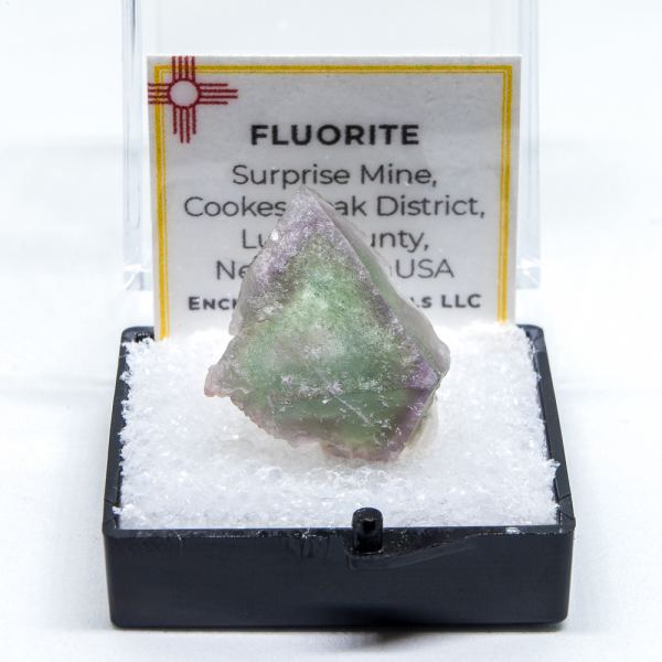 This octahedral crystal of fluorite from the Surprise Mine shows a green core with purple zoning towards the outside of the crystal. These specimens from a one-off pocket feature an unidentified inclusion that appears as a triangular phantom. The phantom is distinct in this specimen.Data last checked on 31st Dec 2021 - specimen may no longer be available