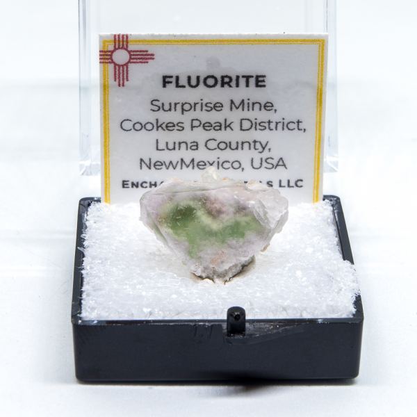 This octahedral crystal of fluorite from the Surprise Mine shows a green core with purple zoning towards the outside of the crystal. These specimens from a one-off pocket feature an unidentified inclusion that appears as a triangular phantom. The phantom is distinct in this specimen and showcases a previous generation of blue cubic fluorite.Data last checked on 31st Dec 2021 - specimen may no longer be available
