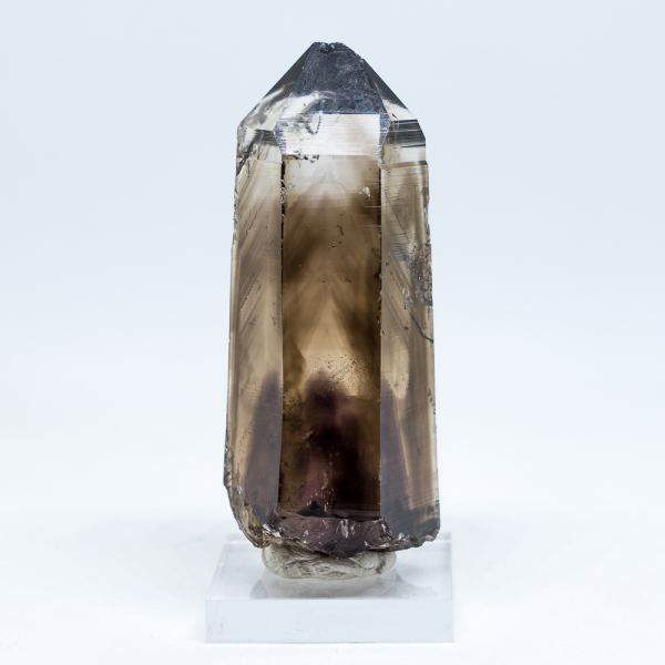 A glassy quartz with characteristic wispy smoky phantoms and a a more unusual amethyst phantom at the base. Some dings, including a prominent one on the rear side of the specimen, as is typical of this location.Data last checked on 31st Dec 2021 - specimen may no longer be available