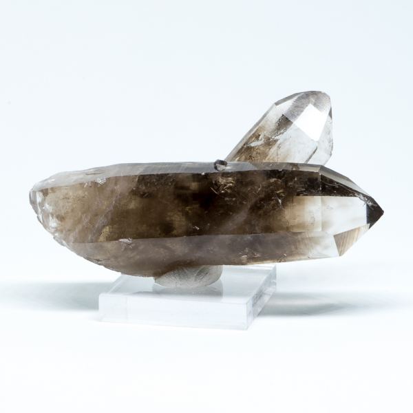 An unusual specimen for the locality: two intergrown quartz crystals with smoky phantoms - the specimen is completely recrystallized, rendering the large crystal doubly terminated and the specimen as a whole a "floater." There is some very minor nicking.Data last checked on 31st Dec 2021 - specimen may no longer be available