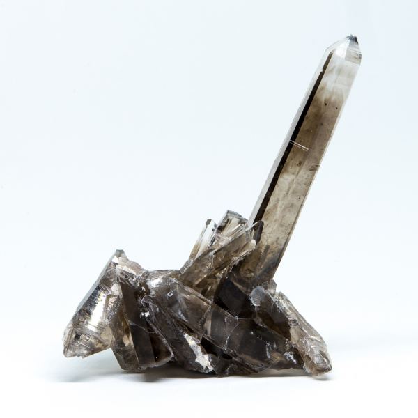 A cluster of quartz crystals with smoky phantoms throughout the length of the crystals. This locality is well known for collapsed pockets, which means finding intact clusters is incredibly difficult. There is some chipping and contacting; many of the crystals on the base are incomplete.Data last checked on 31st Dec 2021 - specimen may no longer be available