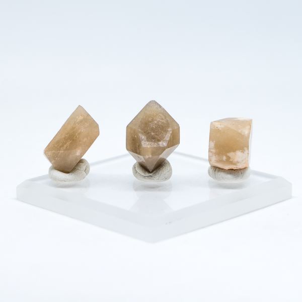 Three specimens of Pecos Valley Diamonds showing some of the variety of forms found. Pecos Valley Diamonds are found embedded in massive evaporative gypsum beds - an intriguing mineralogical origin!Data last checked on 31st Dec 2021 - specimen may no longer be available