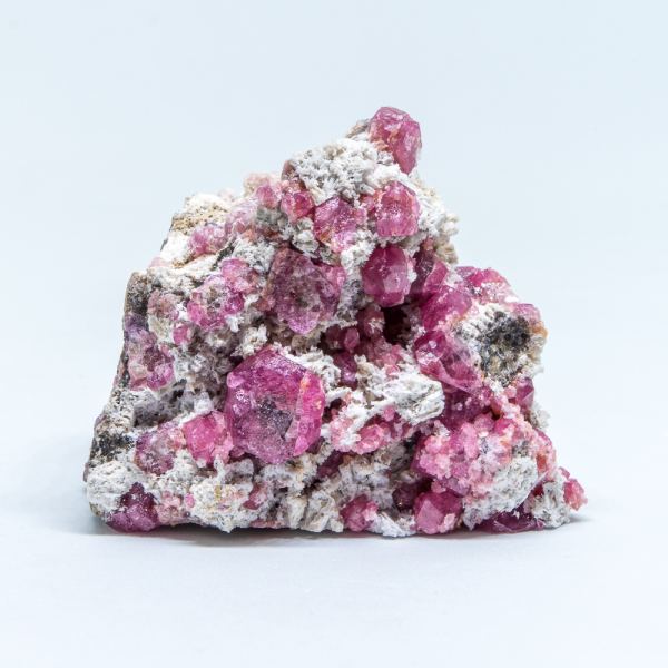 A classic Mexican occurrence: dodecahedral crystals of raspberry-colored grossular crystals sit on matrix. Some crystals show contacting or damage, though this reveals the internal color zoning. Data last checked on 31st Dec 2021 - specimen may no longer be available