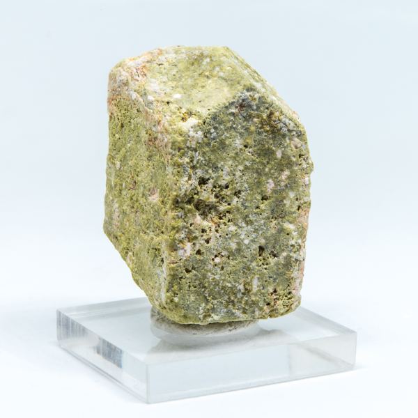 From an exciting new find: pistachio green pseudomorphs of epidote replacing orthoclase crystals! This specimen features a sharp replacement of a single orthoclase crystal. There is some chipping, as well as void spaces caused by an incomplete replacement. While this type of alteration is not unusual, we are unaware of any other worldwide locality that has produced large, euhedral pseudomorphs like these. Collected by Phil Simmons and Erin Delventhal in November of 2020. XRD analysis of this material has pointed towards an undetermined range within the epidote-clinozoisite solution series, as well as the presence of orthoclase, sanidine, and adularia in samples that were not replaced.Data last checked on 31st Dec 2021 - specimen may no longer be available