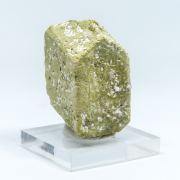 From an exciting new find: pistachio green pseudomorphs of epidote replacing orthoclase crystals! This specimen features a sharp replacement of a Carlsbad law twinned orthoclase on matrix. The specimen is repaired. There is minimal damage. While this type of alteration is not unusual, we are unaware of any other worldwide locality that has produced large, euhedral pseudomorphs like these. Collected by Phil Simmons and Erin Delventhal in November of 2020. XRD analysis of this material has pointed towards an undetermined range within the epidote-clinozoisite solution series, as well as the presence of orthoclase, sanidine, and adularia in samples that were not replaced.Data last checked on 31st Dec 2021 - specimen may no longer be available