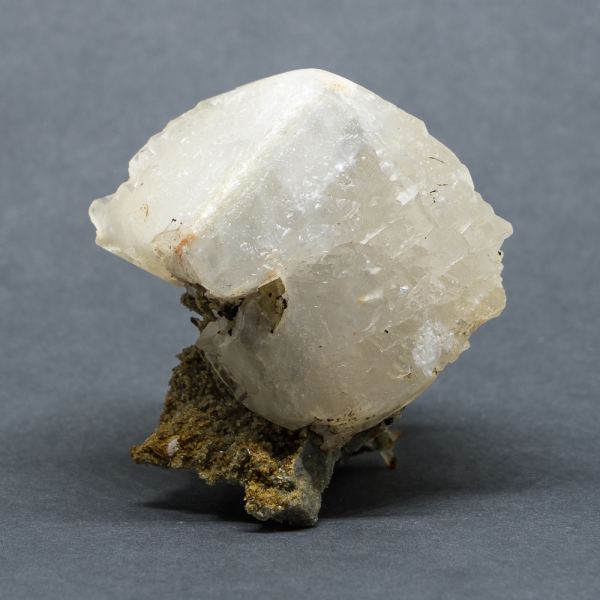 A waxy calcite crystal perched on a "stand" of matrix and small quartz crystals. There is some minor bruising around the base of the calcite crystal.Data last checked on 31st Dec 2021 - specimen may no longer be available