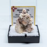 A cluster of calcite crystals from the San Pedro Mine encased in a fine coating of quartz and coated with a later generation of calcite on top of that quartz rind.There is a preferential coating of iron oxide that adds a depth to the texture of the quartz and highlights the form of the primary calcite. The bottom of the specimen is cleaved, and there is some damage to the secondary calcite on top.Data last checked on 31st Dec 2021 - specimen may no longer be available