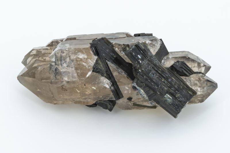 Dark green elbaite crystals penetrating a doubly terminated smoky quartz crystal. Date is unknown, but it was in the Sasha Siemel (1890-1970) collection, who was a famous South American adventurer. There is noticeable chipping on the elbaite and quartz.Data last checked on 31st Dec 2021 - specimen may no longer be available