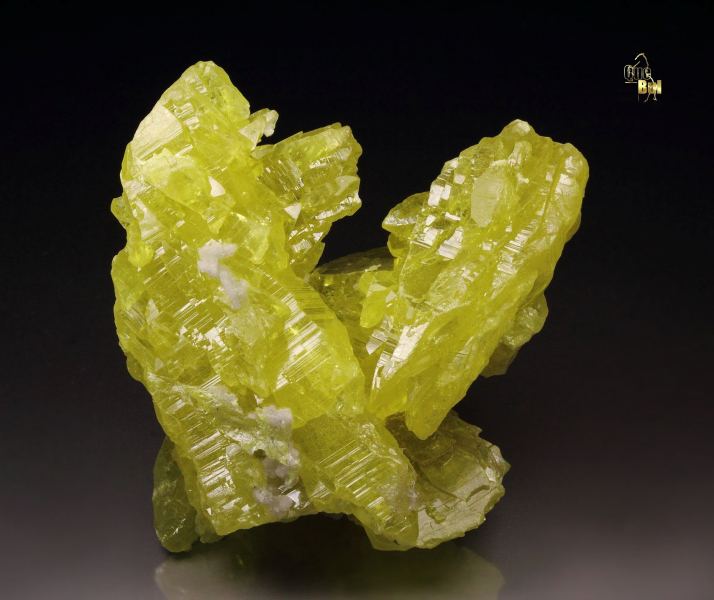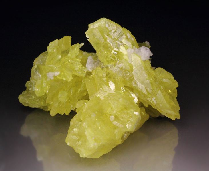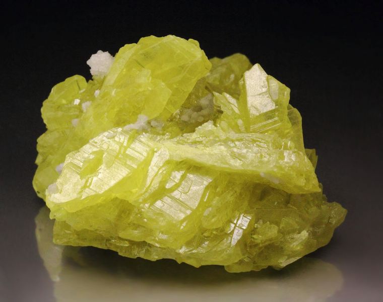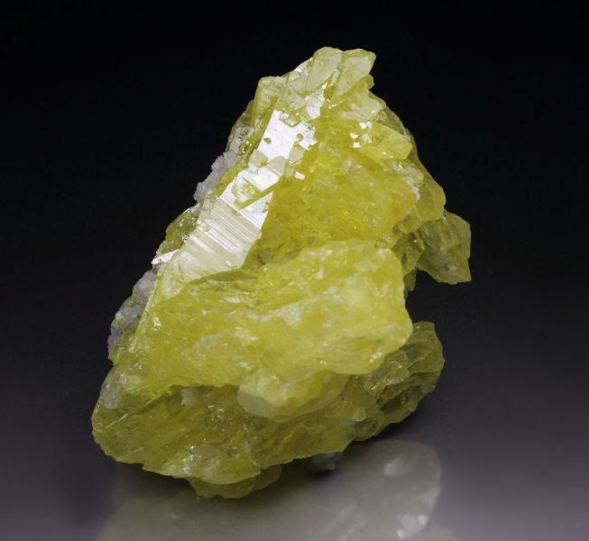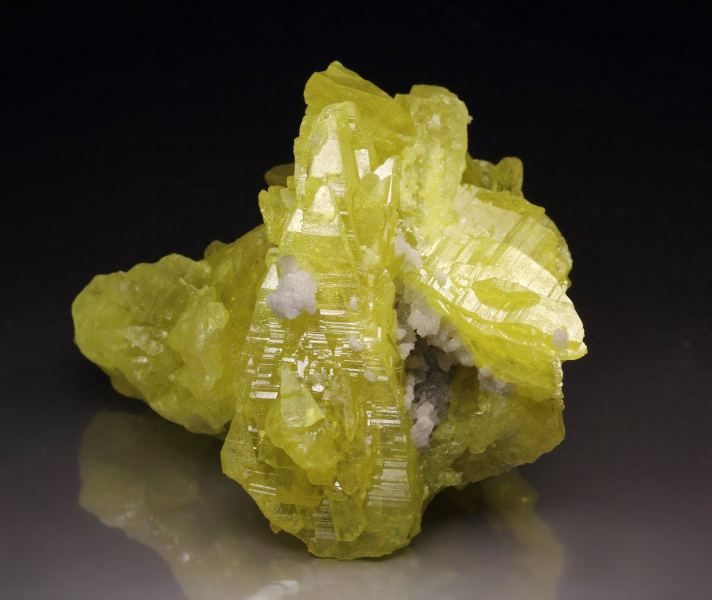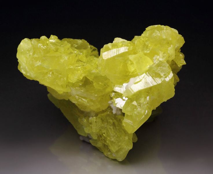 Amazing specimen of gemmy Sulphur crystals with white Aragonite from Perticara Mine, Emilia-Romagna, Italy. It features intense canary-yellow Sulphur crystals. They are very well shaped and sharp. The crystals are transparent, vitreous and strongly glassy-lustrous. They have cool surface striations. It displays beautifully from all sides. Some contacts., Tremendous!Data last checked on 25th Aug 2021 - specimen may no longer be available