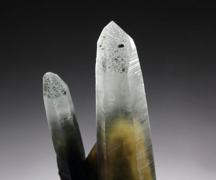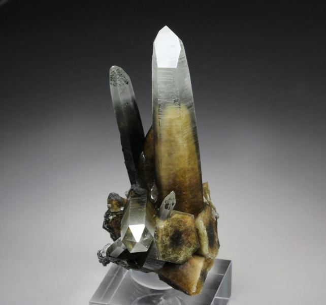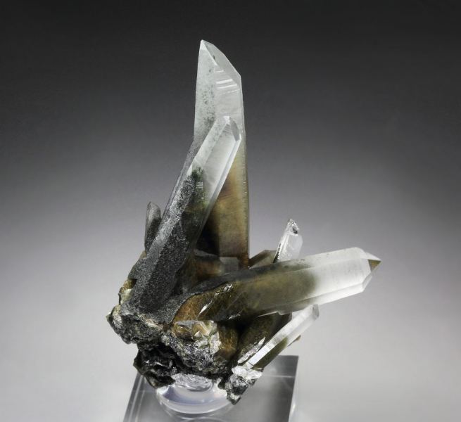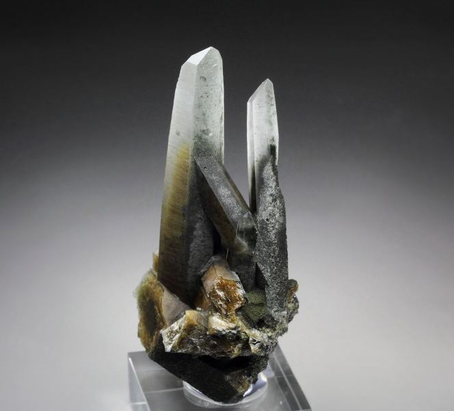 Exquisite specimen of Quartz with Amphibole Group var. Byssolite inclusions from this uncommon locality - Zeballos, British Columbia, Canada. The Quartz crystals have razor sharp elongated habit. They grow in a sculptural cluster. They are transparent and colorless at the tips. Rich tan to green phantoms caused by Byssolite inclusions are seen at the base part. The tan color is due to oxidized Byssolite. The luster is very strong at the tips, to more matt on the striated faces. It displays attractively all over 360 degree. In very good condition – some contacts at the base part. On acrylic base., Beautiful and offbeat Quartz!Data last checked on 25th Aug 2021 - specimen may no longer be available