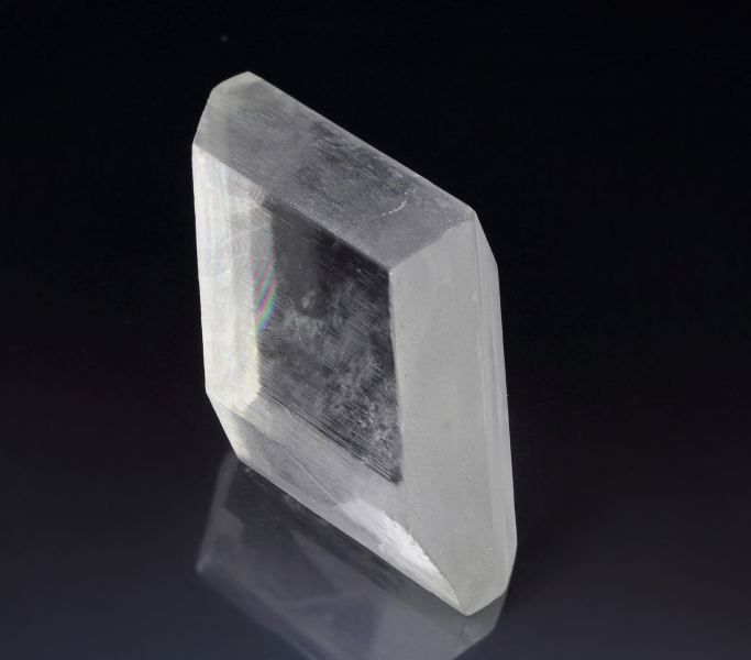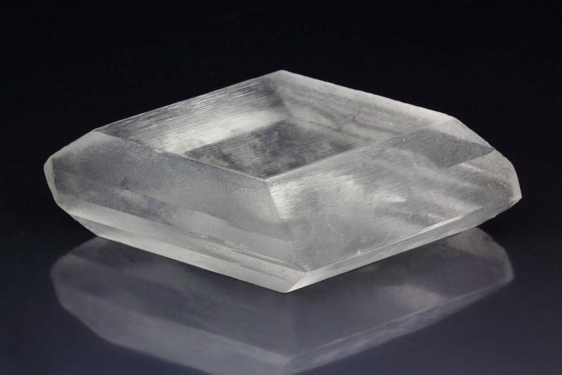 Perfectly shaped like from a text book transparent Gypsum from Willow Creek, Alberta, Canada. It is a single 50mm crystal with razor sharp rhombohedral shape. It has pretty beveled edges. The crystal is transparent, clear and complete all around floater. In excellent condition - some minor imperfections., Cool Gypsum!Data last checked on 25th Aug 2021 - specimen may no longer be available