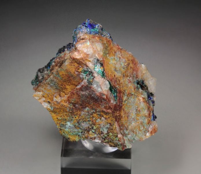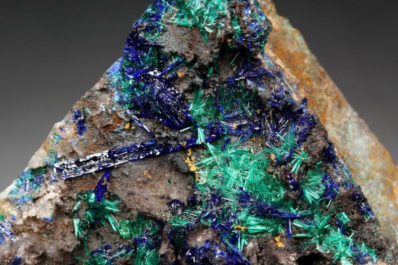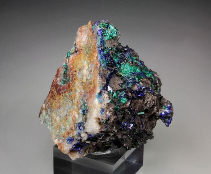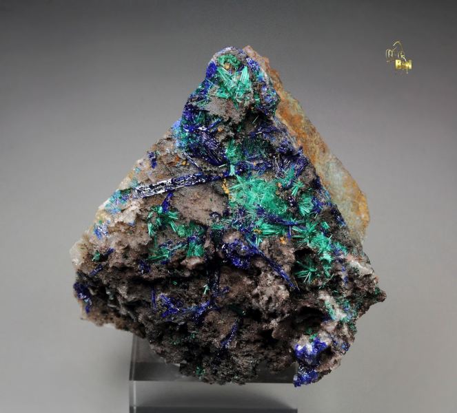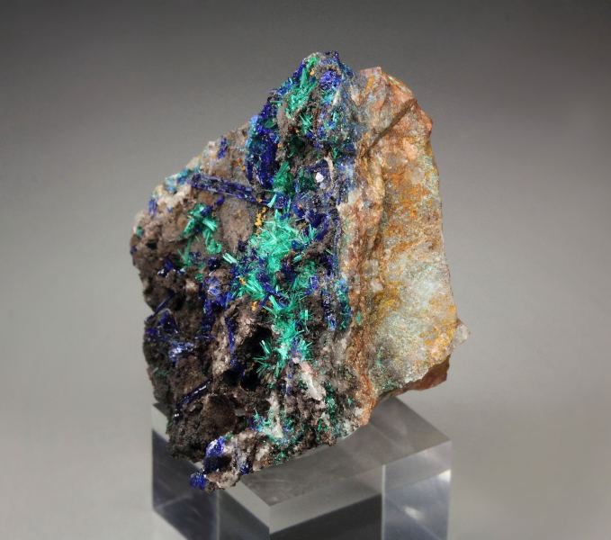 Rare combo specimen of Brochantite with Linarite from Goulmina, Morocco. Vibrant dark green acicular sprays of Brochantite grow on a base. The crystals are very delicate with strong sparkling appearance. The Linarite blade crystals are colored in rich electric royal blue. They are lustrous and sparkling too. The colorfulness of the specimen is very pleasing. In good condition – some small contacts. On acrylic base., Choice Moroccan Brochantite-Linarite piece!Data last checked on 25th Aug 2021 - specimen may no longer be available