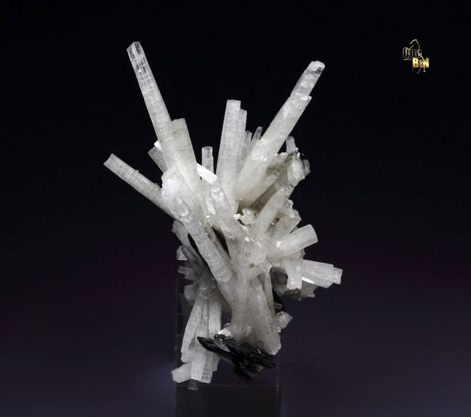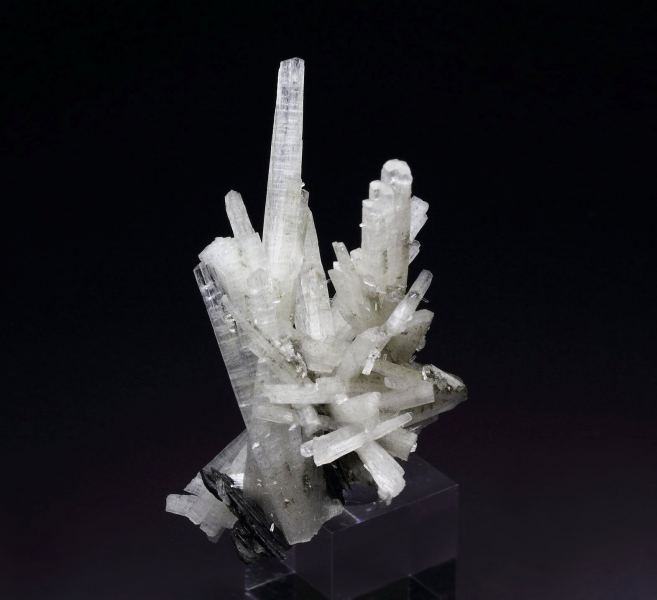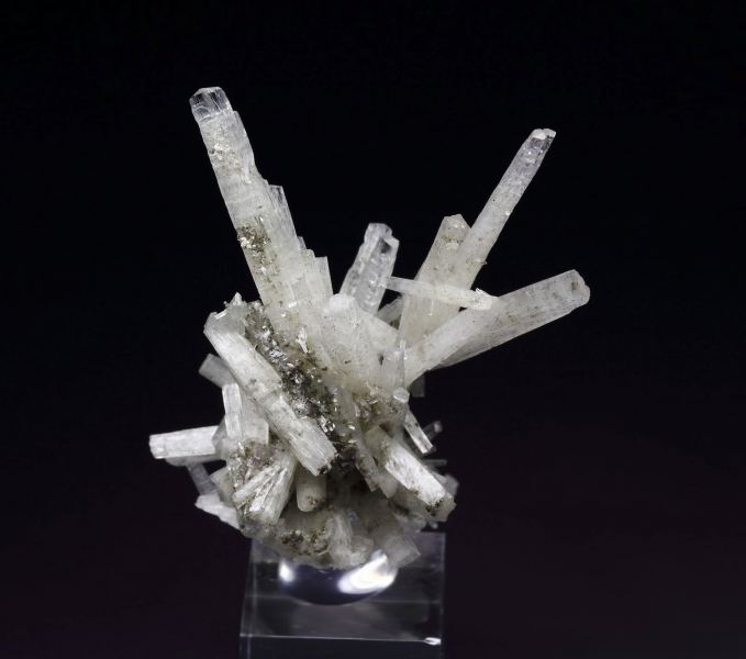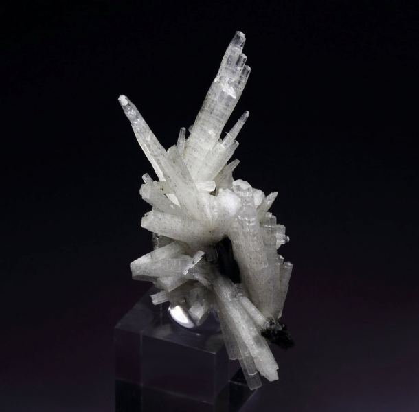 Beautiful specimen of sparkling Natrolite crystals with Aegirine from the famous Mont Saint-Hilaire, Quebec, Canada. The Natrolite crystals are elongated, prismatic and well terminated. They are colorless and lustrous. Well isolated black Aegirine grow among them. It displays sculpturally all over 360 degree. For references see the 1990 issue of The Mineralogical Record vol. 21, # 4. In good condition – some small damages. On acrylic base., Superb!Data last checked on 25th Aug 2021 - specimen may no longer be available