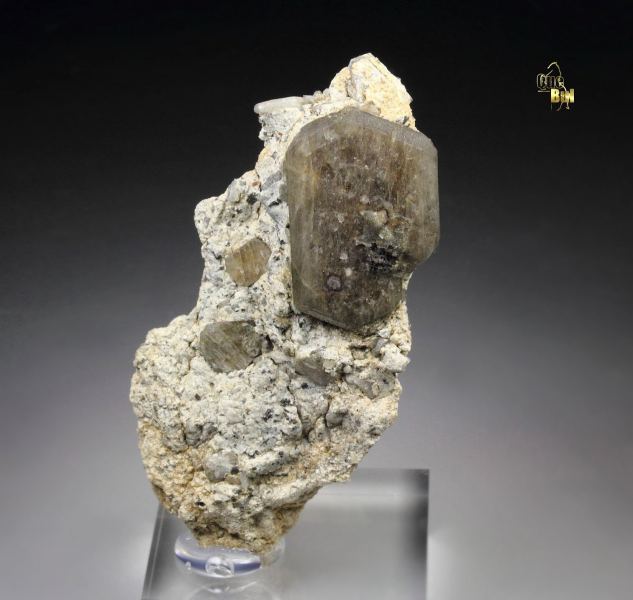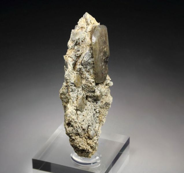 Superb specimen of Sanidine crystals up to 30mm from Fosso Ricomero, Lazio, Italy. It comes from a new find and these are considered among the best Sanidine in the world. The dominant crystal at the top forms an excellent focal point. It has beige-brown color and it is doubly terminated. It is very well definite and sharp flat tabular crystal with a good luster. It is slightly translucent. In superb condition. On acrylic base., World grade quality Sanidine!Data last checked on 25th Aug 2021 - specimen may no longer be available