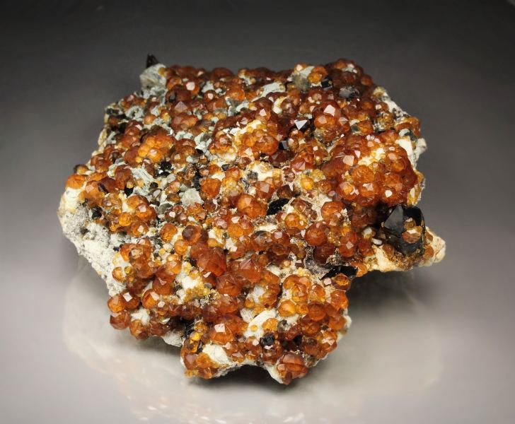 Outstanding specimen of gem and fine Spessartine Garnet crystals up to 4mm densely covering a Microcline base from Tongbei, Fujian Province, China. The Spessartines are well shaped and transparent with rich orange color. The luster is very strong and the crystals just glow. They have sharp trapezohedral habit. Many Muscovite crystals are seen among them. The Smoky Quartz crystals are very sharp, lustrous, transparent and clear with very dark smoky-black color. In excellent condition., First grade Spessartine!Data last checked on 25th Aug 2021 - specimen may no longer be available
