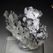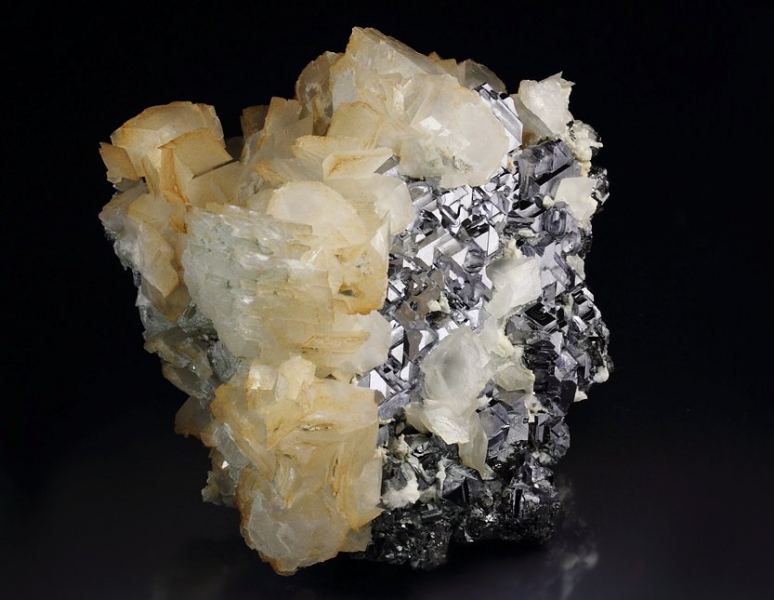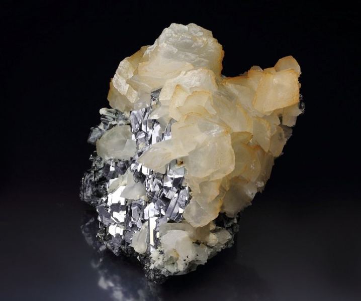 Top piece of bedazzling and impressive mirror lustrous spinel law twin Galena decorated by marvelous Calcite crystals from superb new find in Krushev dol mine, Madan ore field, Bulgaria. The mines in Madan produce some of the finest Galena in the world and this is a killer specimen. It displays sharp, well formed superb flat faces Galena twins with excellent brilliance and light reflection. The spinel twins are very thin stepped plates, staggered one after another with like tooled tips. Lustrous Calcite crystals grow at the top forming aesthetic diadem. They have colored in rusty-orange rims which gives nice colorfulness. In excellent condition – some small nicks., Beautiful world grade quality Spinel Law twin Galena!Data last checked on 25th Aug 2021 - specimen may no longer be available