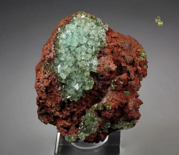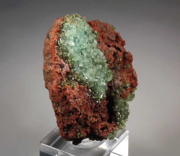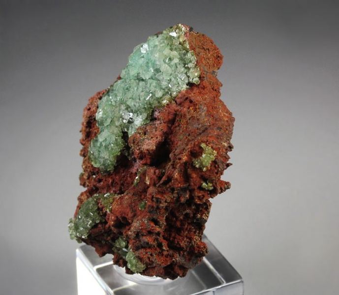 Attractive specimen of Adamite var. Cuprian growing on a red base from the famous Ojuela Mine, Mapimi, Mexico. The Adamite crystals are well shaped with strong luster. They are gemmy and with pleasing mint-green color. The crystals are with fresh appearance and sparkle nicely. The reddish background gives superb colorfulness and contrast. In very good condition – some minor nicks. On acrylic base., Marvelous!Data last checked on 25th Aug 2021 - specimen may no longer be available