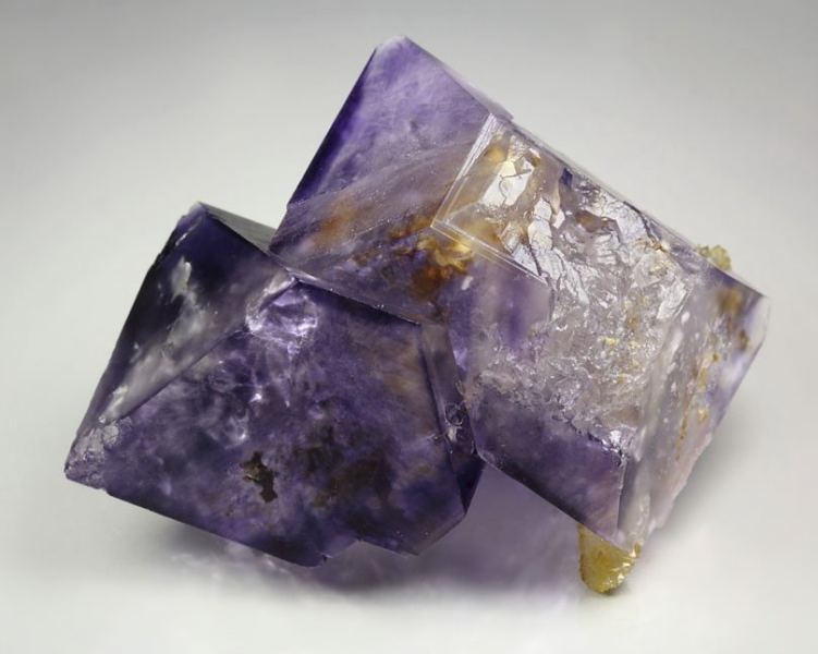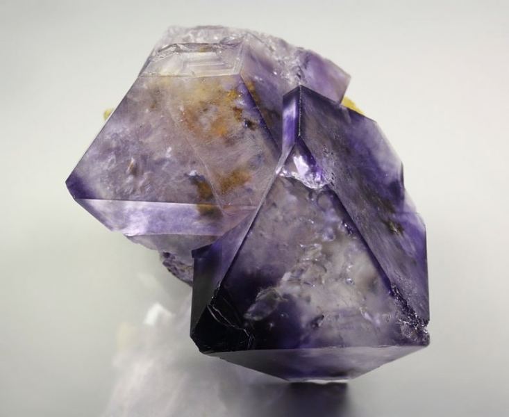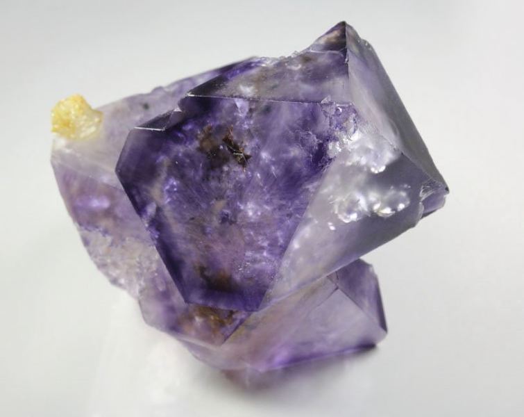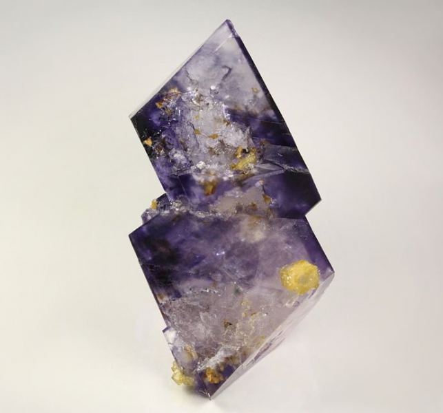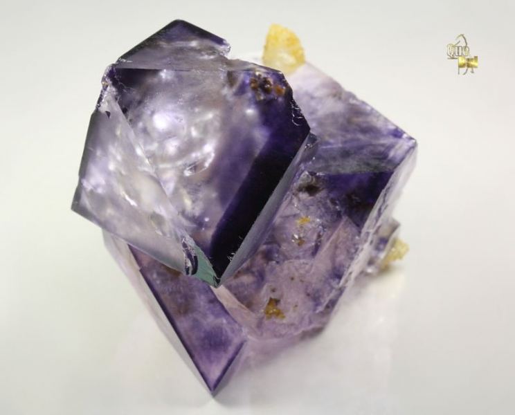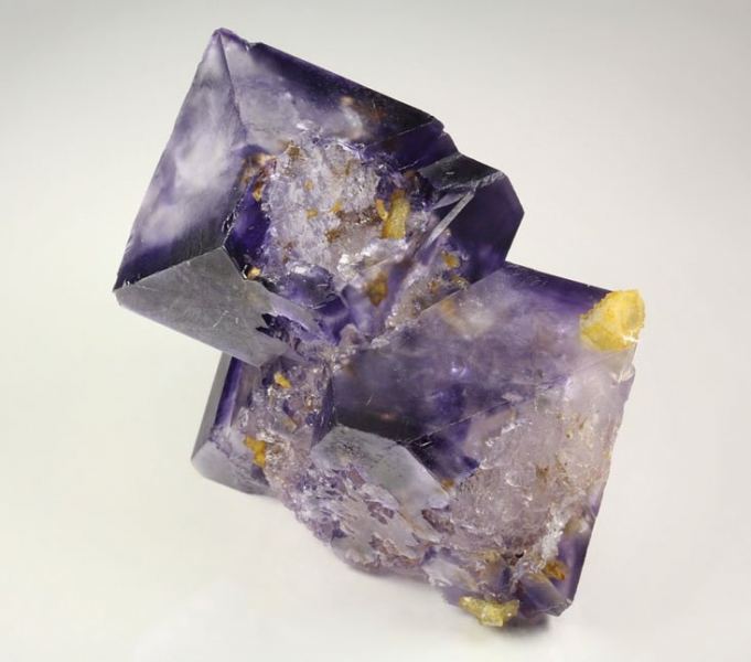 Killer floater specimen of purple Fluorite octahedrons with Quartz decoration from a new find in Huanggang Fe-Sn deposit, Inner Mongolia Autonomous Region, China. Displays perfect, razor sharp octahedral crystals up to 39mm. They are with good luster, transparent, with splendid dark purple phantoms and bright purple to colorless areas. Some inclusions are seen inside the crystals. Small yellowish Quartz crystals grow above. It is complete all over floater specimen with beautiful display from all sides. In good condition – some small damages and natural imperfections., Gorgeous!Data last checked on 25th Aug 2021 - specimen may no longer be available
