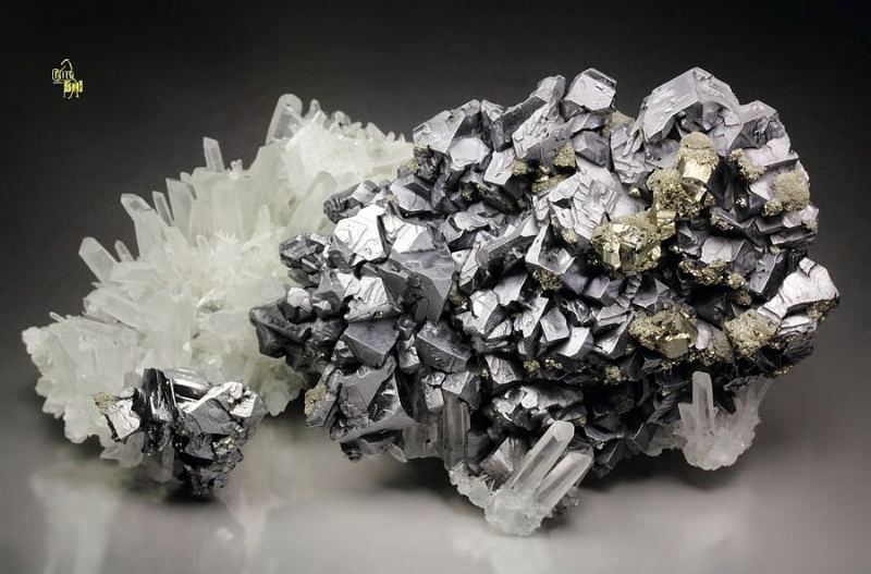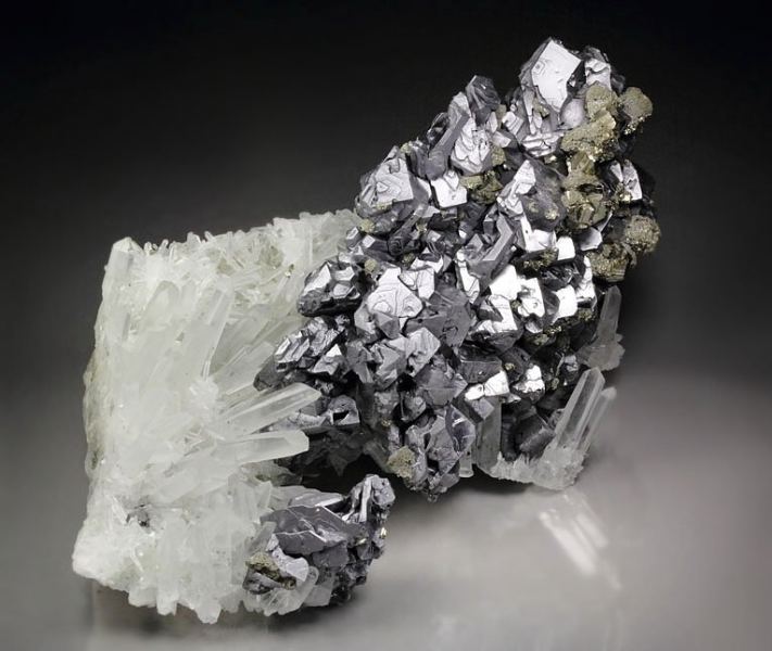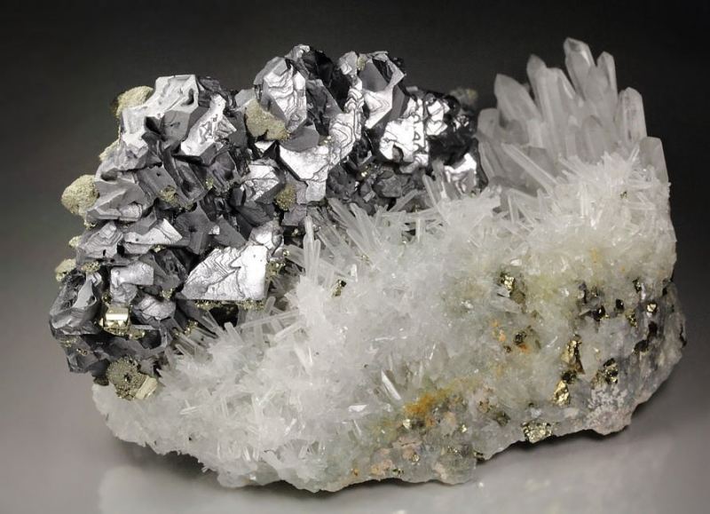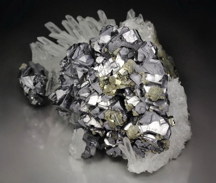 Outstanding specimen of impressive Spinel Law twin Galena decorated by Pyrite on a spiky Quartz base from Madan ore field, Bulgaria. The mines in Madan produce some of the finest Galena in the world and this is a beautiful piece. It displays sharp, well formed Galena twins with matt luster, good brilliance and light reflection. They are terraced and stepped forming one superb plate giving very 3 dimensional display to the specimen. Chunky yellow Pyrite crystals grow above. They are well isolated and enrich the display. Attractive Quartz crystals form the base and add nice contrast. In superb condition – some minor nicks and negligible Quartz damages., Exceptional world grade quality Galena!Data last checked on 25th Aug 2021 - specimen may no longer be available