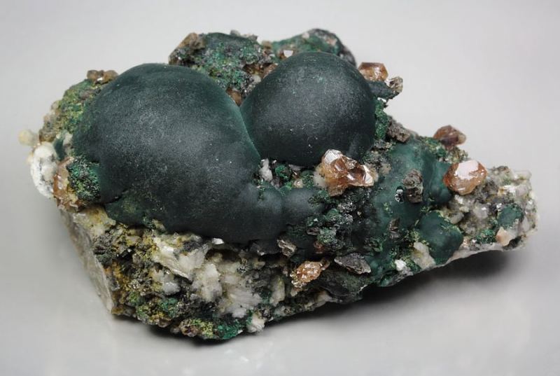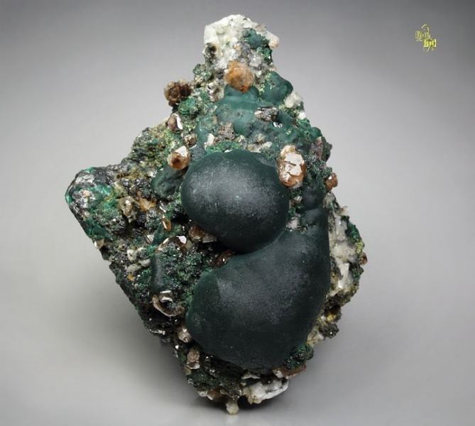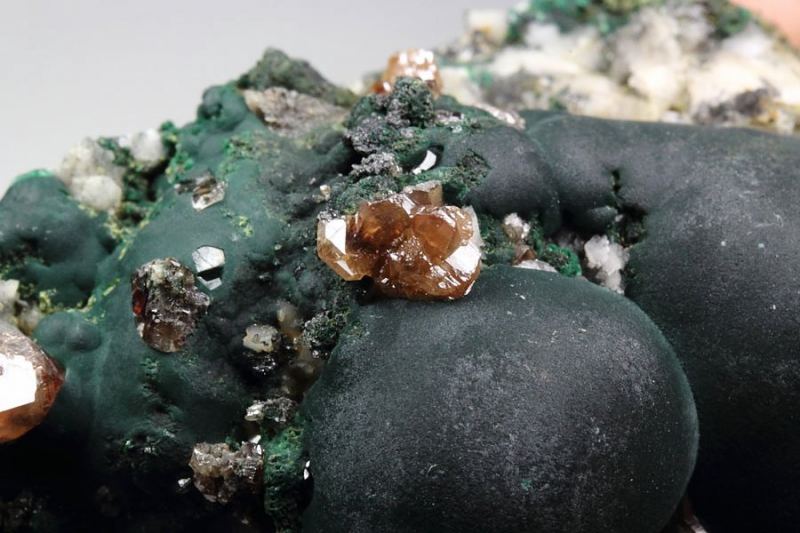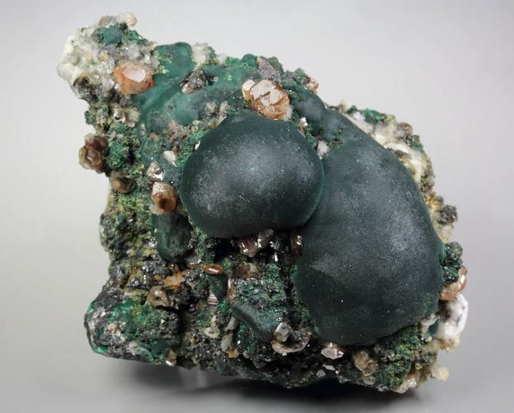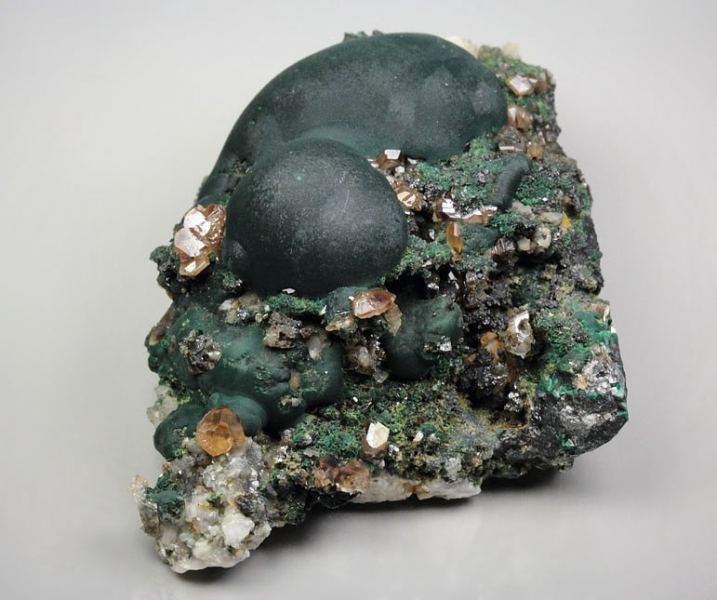 Marvelous combo specimen of gemmy Cerussite crystals decorating Malachite from Brown's Prospect, Australia. It displays curved botryoidal deep green Malachite with waxy luster. The Cerussite has sharp crystals to 4mm with brown color. They have strong luster and good gemminess. The two colors contrast nicely. The mine is flooded. In very good condition – some small nicks and contacts., Offbeat Australian specimen!Data last checked on 25th Aug 2021 - specimen may no longer be available