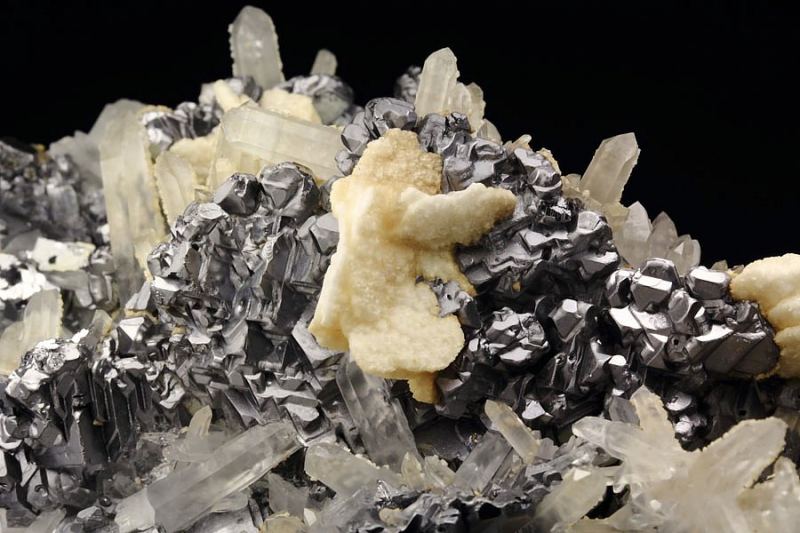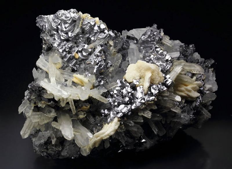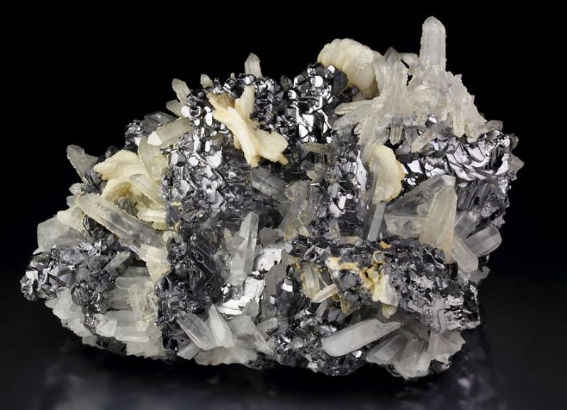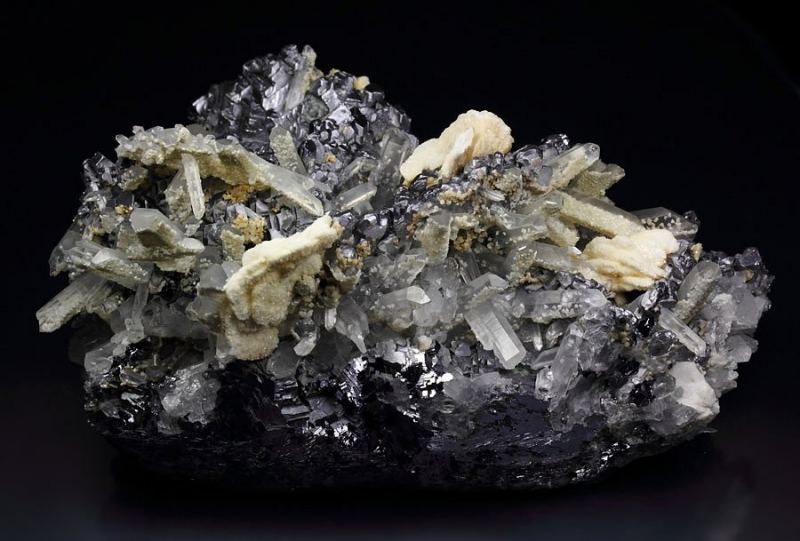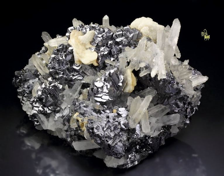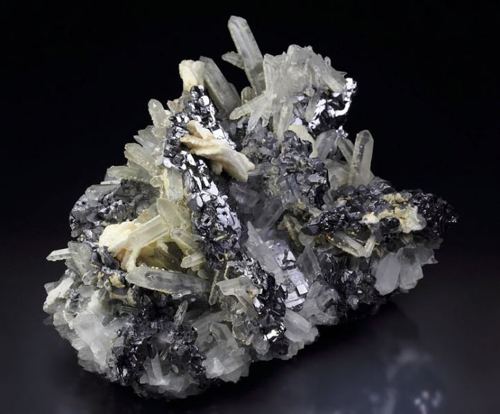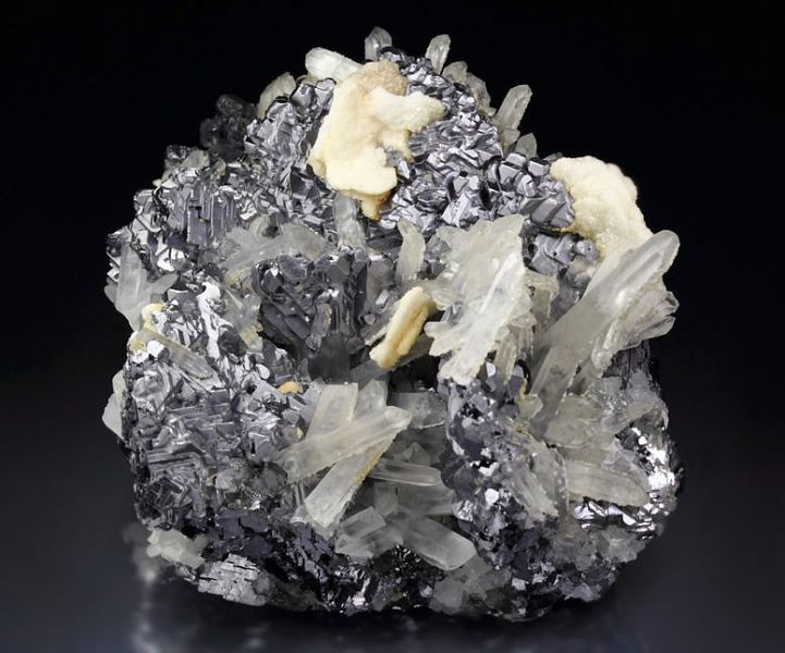 Excellent cabinet specimen of bright, metallic Spinel Law twin Galena with Quartz crystals. At the top are growing beautiful Calcite flowers with white color. They are roses and pop up nicely. Galena spinel twins have stepped growth and good luster. Elegant, isolated Quartz crystals enrich nicely the display. They are transparent with back side Calcite cover. In excellent condition – some minor damages., Wonderful addition for every fine collection!Data last checked on 25th Aug 2021 - specimen may no longer be available