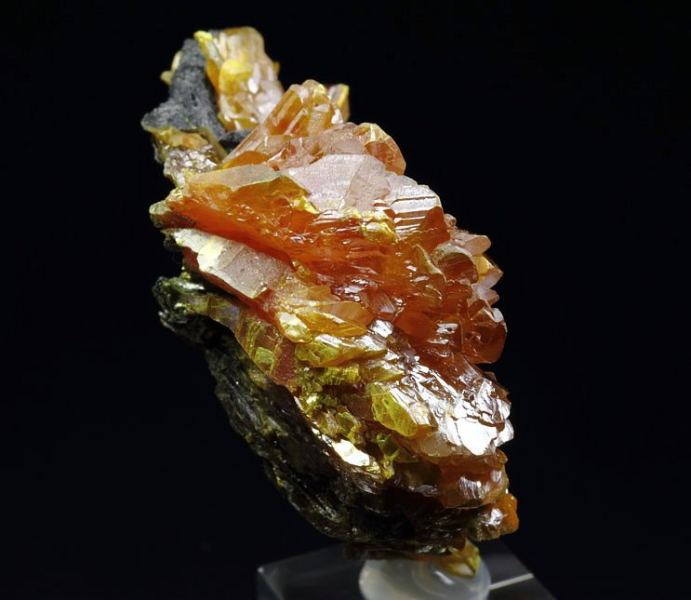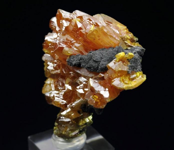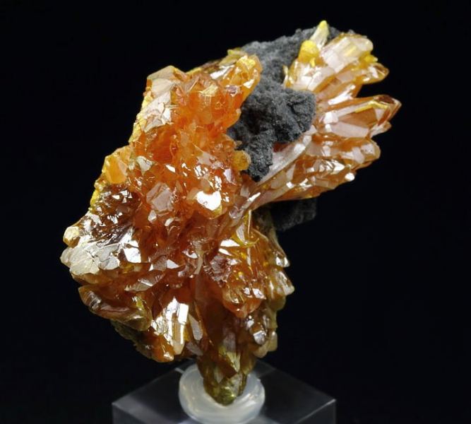 Amazing spray of Orpiment blades forming a beautiful cluster from the famous find in Twin Creeks Mine, Nevada. The specimen has very elegant display with well shaped Orpiment crystals - very fresh and lustrous. The color is rich and intense orange, which is simply striking. In excellent condition – some small bruises. On acrylic base., Gorgeous!Data last checked on 25th Aug 2021 - specimen may no longer be available