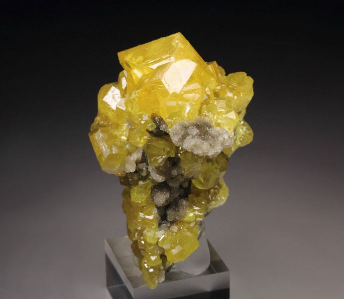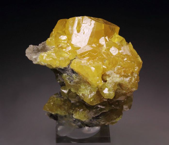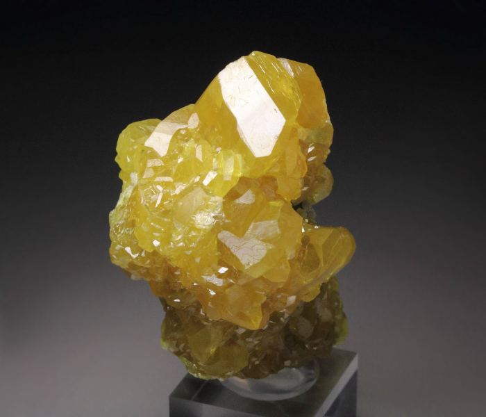 Fascinating specimen of Sulphur crystals from this uncommon locality - Machow mine, Poland. It features intense and saturated orange-yellow Sulphur crystals. They are very well shaped and sharp with good transparency. The luster is strong and the faces are light reflective. In very good condition – some small nicks and contacts. On acrylic base., Choice Poland Sulphur!Data last checked on 25th Aug 2021 - specimen may no longer be available