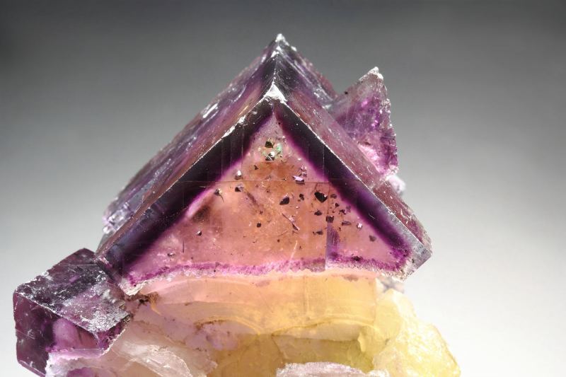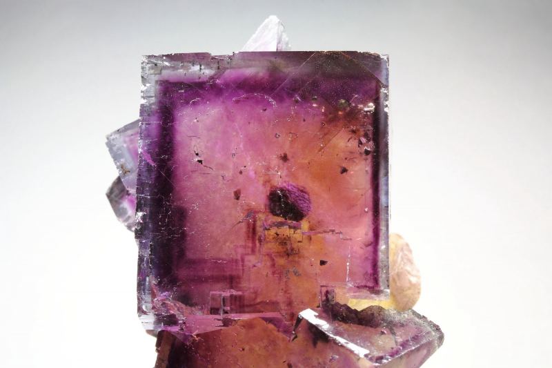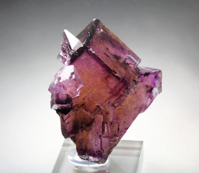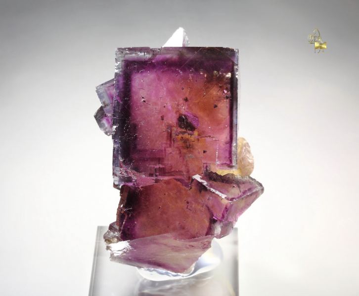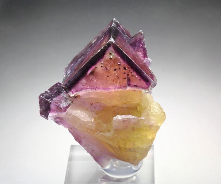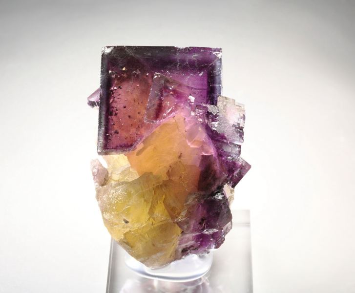 Exceptional Fluorite with colorful phantoms from this great and closed mine - Minerva No. 1 Mine, Cave-in-Rock, Illinois, United States. The crystals are glassy lustrous and light reflective. They have from rich yellow core to very saturated purple at the top. The cubes are razor sharp and highly transparent. The real beauty in this specimen is the intense purple phantoms which have very sharp and geometrical shape. The colors intensity is amazing. The Fluorite has inclusions of small yellow Chalcopyrite crystals. It displays attractively all over 360 degree. In very good condition – some small nicks. On acrylic base., Crazy colors!Data last checked on 25th Aug 2021 - specimen may no longer be available