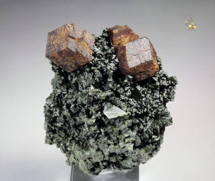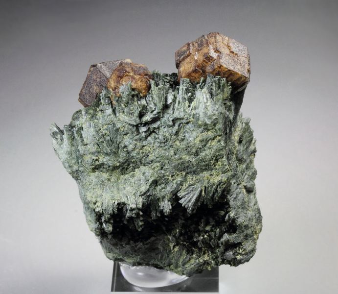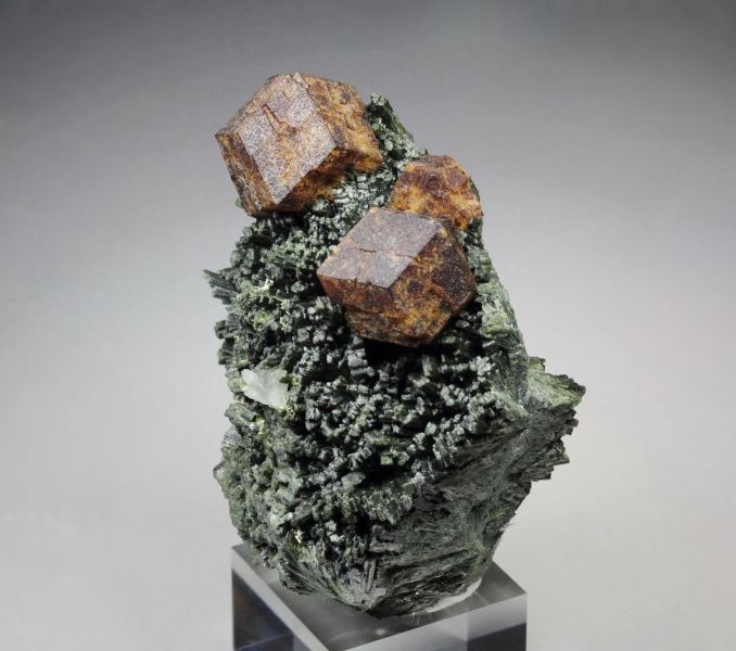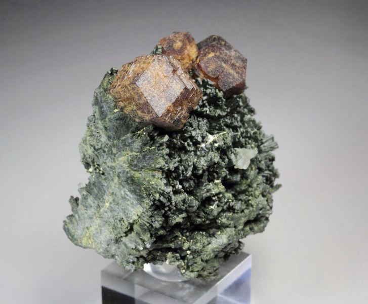 Beautiful specimen of sharp Garnet var. Andradite crystals on Hedenbergite base from Serifos Island, Greece. Rhombic dodecahedral Andradite crystals up to 13mm are nestled on green Hedenbergite. The Garnets are with pleasant brown color, very well crystallized, with sharp edges and matt lustrous. They are very well isolated and they form an excellent focal point at the top. The matrix is of parallel Hedenbergite columns, growing in a cluster. Small Quartz is seen too. In very good condition – some base part contact. On acrylic base., Fascinating combo!Data last checked on 25th Aug 2021 - specimen may no longer be available